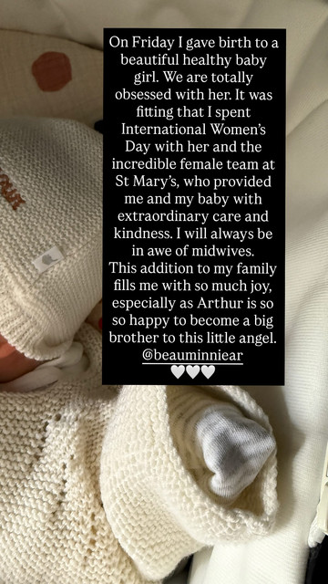 Η τραγουδίστρια πρόσθεσε ότι το νέο μέλος της οικογένειας την γεμίζει χαρά, επισημαίνοντας ότι ο γιος της ανυπομονεί για τον νέο του ρόλο: «Αυτή η προσθήκη στην οικογένειά μου με γεμίζει τόση χαρά, ειδικά καθώς ο Άρθουρ είναι τόσο χαρούμενος που γίνεται μεγάλος αδελφός για αυτόν τον μικρό άγγελο».