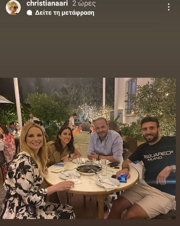 Η παρουσιάστρια και ο ποδοσφαιριστής επέλεξαν να δειπνήσουν σε γνωστό εστιατόριο της πρωτεύουσας με τους κουμπάρους τους, Φιλιώ Τριλίδου και Μιχάλη Ιωνά. Σε ένα ευχάριστο κλίμα, η Χριστιάνα μοιράστηκε μια φωτογραφία στα Instagram stories της από την βραδιά.