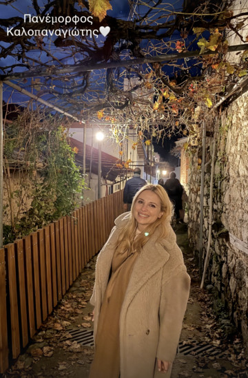 Η οικογένεια απόλαυσε τη βόλτα της στα γραφικά, στολισμένα σοκάκια του χωριού, σε μια ατμόσφαιρα γεμάτη φώτα, γιορτικές μελωδίες και αρώματα Χριστουγέννων, αφήνοντας για λίγο στην άκρη τις επαγγελματικές υποχρεώσεις.