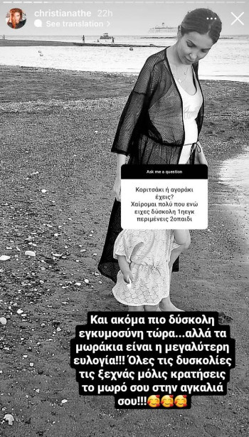 Η ίδια είχε εμφανιστεί πρόσφατα στην εκπομπή ”Με αγάπη Χριστιάνα” και είχε μιλήσει για την δεύτερη εγκυμοσύνη της αλλά και τον λόγο που δεν αποκαλύπτει πόσο μηνών είναι.