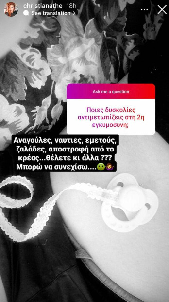 Μέσα από πρόσφατο Q&A που είχε με τους ακόλουθούς της στο προσωπικό της λογαριασμό στο Instagram, η ηθοποιός μίλησε για τις δυσκολίες που αντιμετωπίζει στην εγκυμοσύνη της. Συγκεκριμένα, ανάφερε ότι η δεύτερη εγκυμοσύνη είναι δυσκολότερη από την πρώτη της και ότι έχει πολλά συμπτώματα όπως αναγούλες, ναυτίες, εμετούς, ζαλάδες και πολλά άλλα.