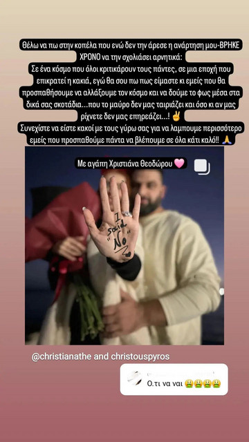 Η Χριστιάνα Θεοδώρου, πρόσφατα δέχθηκε πρόταση γάμου από τον σύντροφό της και από τότε έχει μοιραστεί μερικές δημοσιεύσεις με τους ακόλουθούς της στο Instagram για το ευχάριστο γεγονός. Ωστόσο, σε μια από αυτές μια κοπέλα σχολίασε αρνητικά τη δημοσίευση της γράφοντας συγκεκριμένα: “Ό,τι να ναι” .