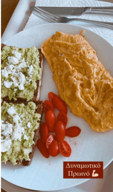 Όπως, θα δείτε στη φωτογραφία παρακάτω, η Χριστίνα Μπόμπα το πρωί τρώει ομελέτα, δυο φέτες ψωμί με αβοκάντο και cottage και ντοματίνια.