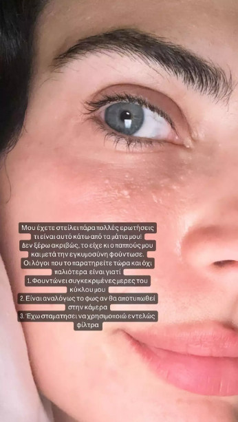 «Μου έχετε στείλει πάρα πολλές ερωτήσεις τι είναι αυτό κάτω από τα μάτια μου. Δεν ξέρω ακριβώς, το είχε και ο παππούς μου και μετά την εγκυμοσύνη φούντωσε. Οι λόγοι που το παρατηρείτε τώρα και όχι παλιότερα είναι γιατί: