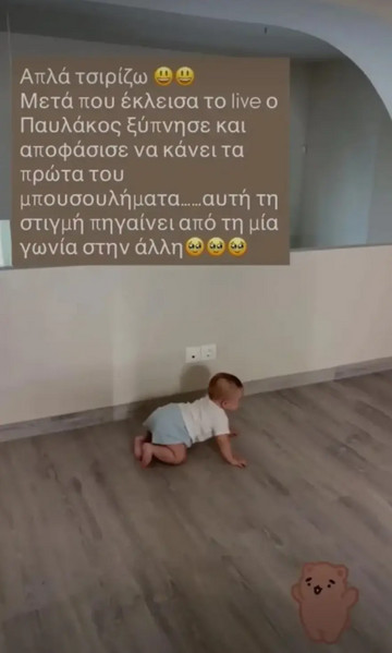 «Απλά τσιρίζω. Μετά που έκλεισα το live, ο Παυλάκος ξύπνησε και αποφάσισε να κάνει τα πρώτα του μπουσουλήματα… Αυτή τη στιγμή πηγαίνει από τη μία γωνία στην άλλη», έγραψε η Αννίτα Μπραντ πάνω στη φωτογραφία.
