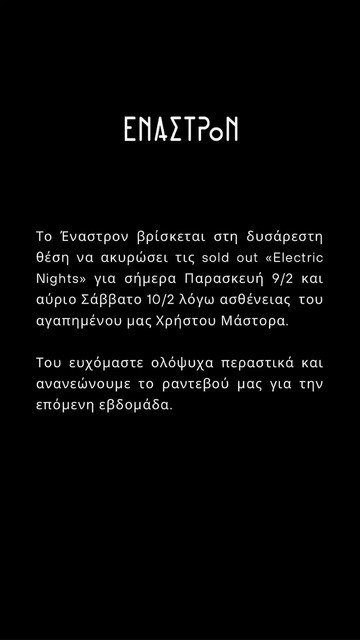 «Το Έναστρον βρίσκεται στη δυσάρεστη θέση να ακυρώσει τις sold out εμφανίσεις για σήμερα Παρασκευή 9/2 και αύριο Σάββατο 10/2 λόγω ασθένειας του αγαπημένου μας, Χρήστου Μάστορα. Του ευχόμαστε ολόψυχα περαστικά και ανανεώνουμε το ραντεβού μας για την επόμενη εβδομάδα» αναφέρει η ανακοίνωση του μαγαζιού.