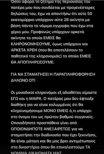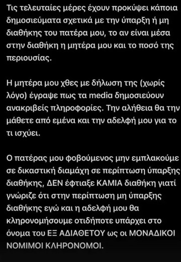 «Τις τελευταίες μέρες έχουν προκύψει κάποια δημοσιεύματα σχετικά με την ύπαρξη ή μη διαθήκης του πατέρα μου, το αν είναι μέσα στη διαθήκη η μητέρα μου και το ποσό της περιουσίας. Η μητέρα μου χθες με δήλωσή της (χωρίς λόγο) έγραψε πως τα media δημοσιεύουν ανακριβείς πληροφορίες. Την αλήθεια θα την μάθετε από εμένα και την αδελφή μου για το τι ισχύει.