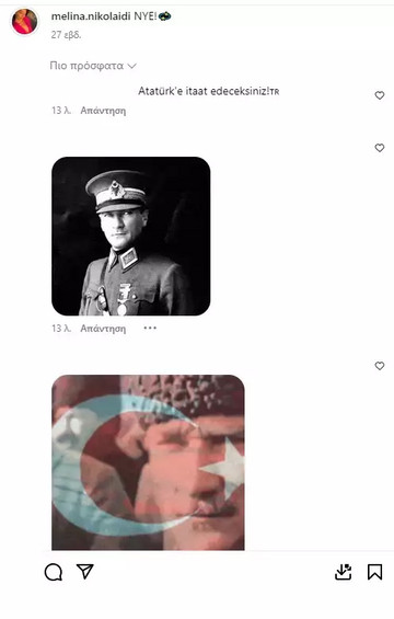 Μετά την απόφαση της τραγουδίστριας να μην πραγματοποιήσει τη συναυλία της, πολλοί είναι οι Τούρκοι που έχουν μπει στο Instagram της Δέσποινας Βανδή και σχολιάζουν με επιθετικό τρόπο τις φωτογραφίες της κατηγορώντας τη για ασέβεια, λέγοντάς της να μην ξαναπεράσει τα σύνορα της χώρας της και βάζοντας φωτογραφίες του Κεμάλ Ατατούρκ.