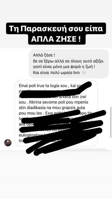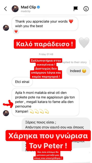 Ειδικότερα, η Δήμητρα Αλεξανδράκη κοινοποίησε στον προσωπικό της λογαριασμό στο instagram μία σειρά από stories με συνομιλία της με τον Mad Clip. Η Δήμητρα έξι μέρες πριν τον θάνατό του είχε πει “απλά ζήσε”, ενώ ο άτυχος trapper φαίνεται να της λέει πως “κανένας δεν πρόκειται να τον αγαπήσει γι’ αυτό που είναι”.