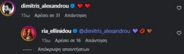 Λίγο αργότερα, ήρθε και μια πιο τρυφερή, αλλά εξίσου χαμηλών τόνων, δημόσια κίνηση. Ο Δημήτρης Αλεξάνδρου σχολίασε με καρδιές την πρόσφατη ανάρτηση της Ρίας Ελληνίδου στα social media, όπου η τραγουδίστρια ερμηνεύει το