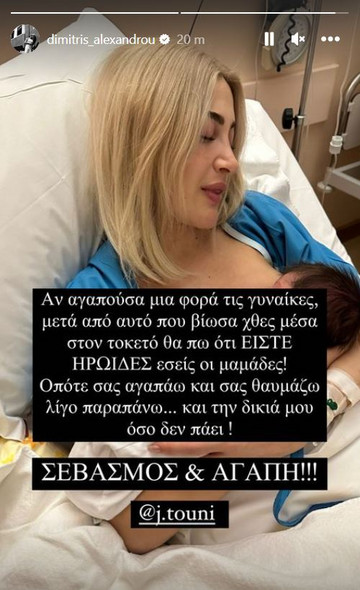 «Αν αγαπούσα μια φορά τις γυναίκες μετά από αυτό που βίωσα χθες μέσα στον τοκετό, θα πω ότι είστε ΗΡΩΙΔΕΣ εσείς οι μαμάδες. Οπότε σας αγαπώ και σας θαυμάζω λίγο παραπάνω… και την δικιά μου όσο δεν πάει! Σεβασμός και αγάπη!!!» έγραψε ο Δημήτρης Αλεξάνδρου.