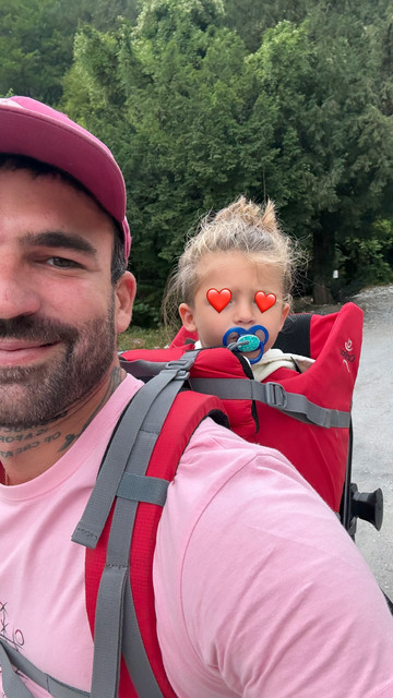Μπαμπάς και γιος περπάτησαν στα μονοπάτια του βουνού, θαύμασαν το επιβλητικό τοπίο και μοιράστηκαν μικρές, αλλά πολύτιμες στιγμές μαζί. Ο μικρός Πάρης κάποια στιγμή κουράστηκε, κι όπως ήταν αναμενόμενο, βρέθηκε αγκαλιά και στους ώμους του μπαμπά του, απολαμβάνοντας τη διαδρομή από… ψηλά.