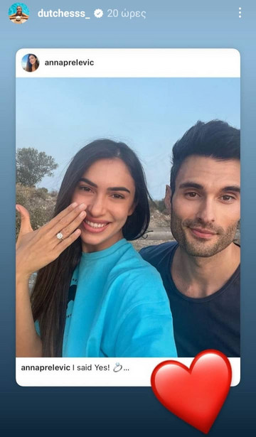 Συγκεκριμένα, η Δούκισσα έκανε repost την δημοσίευση με το ζευγάρι που ποζάρει με το μονόπετρο, και πρόσθεσε μια μεγάλη κόκκινη καρδιά.
