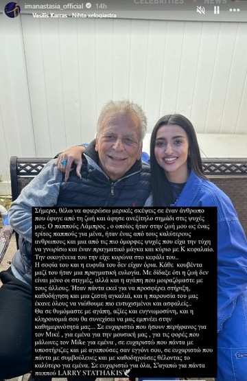 “Σήμερα, θέλω να αφιερώσω μερικές σκέψεις σε έναν άνθρωπο που έφυγε από τη ζωή και άφησε ανεξίτηλο σημάδι στις ψυχές μας. Ο παππούς Λάμπρος, ο οποίος ήταν στην ζωή μου ως ένας τρίτος παππούς για μένα, ήταν ένας από τους καλύτερους ανθρώπους και μια από τις πιο όμορφες ψυχές που είχα την τύχη να γνωρίσω και έναν πραγματικό μάγκα και κύριο με Κ κεφαλαίο. Την οικογένειά του είχε κορώνα στο κεφάλι του. Η σοφία του και η ευφυΐα του δεν είχαν όρια. Κάθε κουβέντα μαζί του ήταν μια πραγματική ευλογία. Με δίδαξε ότι η ζωή δεν είναι μόνο οι στιγμές, αλλά και η αγάπη που μοιραζόμαστε με τους άλλους. Ήταν πάντα εκεί για να προσφέρει στήριξη, καθοδήγηση και μια ζεστή αγκαλιά και η παρουσία του μας έκανε όλους να νιώθουμε πιο ευτυχισμένοι και ασφαλείς. Θα σε θυμόμαστε με αγάπη, αξίες και ευγνωμοσύνη και η κληρονομιά σου θα συνεχίσει να μας εμπνέει στην καθημερινότητά μας. Σ’ ευχαριστώ που ήσουν περήφανος για τον Μικέ, για εμένα, για την μουσική μας, για τις φορές που μάλωνες τον Μικέ για εμένα. Σ’ ευχαριστώ που πάντα με υποστήριζες και με αγαπούσες σαν εγγόνι σου, σ’ ευχαριστώ που πάντα με συμβούλευες και με καθοδηγούσες θέλοντας το καλύτερο για εμένα. Σ’ ευχαριστώ για όλα. Σ’ αγαπώ για πάντα παππού. Larry Stathakis”, έγραψε η Αναστασία.