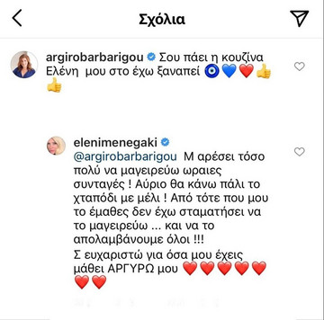 Η ίδια δεν δίστασε να της γράψει πως λατρεύει να μαγειρεύει για την οικογένεια, ενώ μοιράστηκε και ένα “ευχαριστώ” για μυστικά της κουζίνας που έμαθε απ’ αυτήν μέσα στα χρόνια που συνεργάζονταν στην εκπομπή.