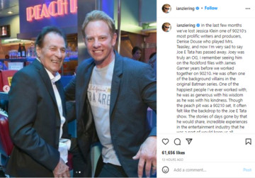 «Τους τελευταίους μήνες χάσαμε την Jessica Klein, μια από τις πιο παραγωγικές συγγραφείς και παραγωγούς του 90210, την Denise Douse που έπαιζε την κυρία Teasley, και τώρα είμαι πολύ λυπημένος που ο Joe E Tata πέθανε», έγραψε ο ηθοποιός από το Μπέβερλι Χιλς, Ian Zeiring.