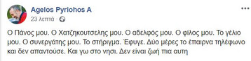Ο Πάνος μου. Ο Χατζηκουτσέλης μου. Ο αδελφός μου. Ο φίλος μου. Το γέλιο μου. Ο συνεργάτης μου. Το στήριγμα. Έφυγε. Δύο μέρες το έπαιρνα τηλέφωνο και δεν απαντούσε. Και γω στο νησί. Δεν είναι ζωή πια αυτή
