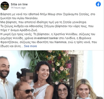 Η μικρή πήρε το όνομα Αριάδνη-Ζωή και έκτός από την Ντέμι Μουρ είχε άλλες δύο νονές, την Χριστίνα Ψιλλίδου, σύζυγο του Δημήτρη Ψιλλίδη, χρόνια investment banker στο Λονδίνο και την Βερόνικα Φραντζέσκου, σύζυγο του ιδιοκτήτη του Nammos.
