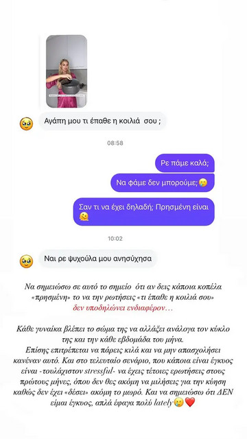 «Να σημειώσω σε αυτό το σημείο ότι αν δεις κάποια κοπέλα πρησμένη, το να τη ρωτήσεις “τι έπαθε η κοιλιά σου” δεν υποδηλώνει ενδιαφέρον. Κάθε γυναίκα βλέπει το σώμα της να αλλάζει ανάλογα τον κύκλο της και την κάθε εβδομάδα του μήνα.