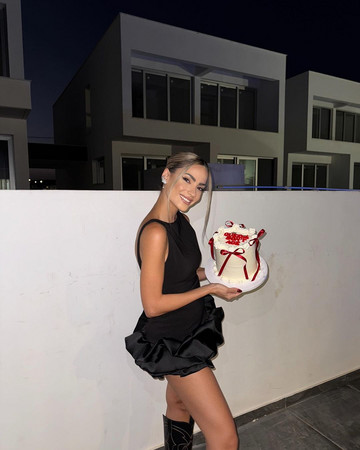 Κρατώντας μια εντυπωσιακή τούρτα με κόκκινες λεπτομέρειες, η Ειρήνη φαίνεται να απολαμβάνει απόλυτα τη στιγμή, με τη λάμψη και τη χαρά να είναι εμφανείς στο χαμόγελό της.
