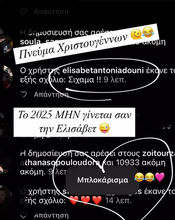 Πιο συγκεκριμένα, η Δανάη Μπάρκα δημοσίευσε στον προσωπικό της λογαριασμό στο Instagram το σχόλιο που έλαβε, το οποίο τη χαρακτήριζε “Σίχαμα”, με την ίδια να απαντά μεταξύ σοβαρού και αστείου: «Πνεύμα Χριστουγέννων…. Το 2025 μη γίνεις σαν την Ελισάβετ… Μπλοκάρισμα».