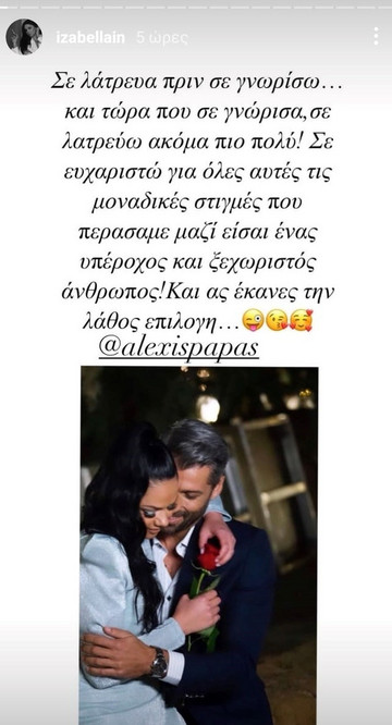 Στο πρώτο της μήνυμα στο Instagram μετά την αποχώρησή της από το «The Bachelor», η Ιζαμπέλα απευθυνόμενη στον Αλέξη Παππά έγραψε: «Σε λάτρευα πριν σε γνωρίσω… και τώρα που σε γνώρισα σε λατρεύω ακόμα πιο πολύ. Σε ευχαριστώ για όλες αυτές τις μοναδικές στιγμές που περάσαμε μαζί. Είσαι ένας υπέροχος και ξεχωριστός άνθρωπος. Κι ας έκανες τη λάθος επιλογή».