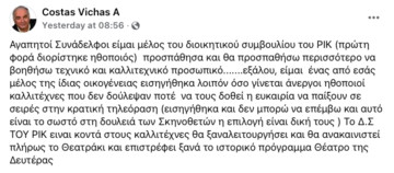 “Αγαπητοί Συνάδελφοι είμαι μέλος του διοικητικού συμβουλίου του ΡΙΚ (πρώτη φορά διορίστηκε ηθοποιός) προσπάθησα και θα προσπαθήσω περισσότερο να βοηθήσω τεχνικό και καλλιτεχνικό προσωπικό…….εξάλλου, είμαι ένας από εσάς μέλος της ίδιας οικογένειας εισηγήθηκα λοιπόν όσο γίνεται άνεργοι ηθοποιοί καλλιτέχνες που δεν δούλεψαν ποτέ να τους δοθεί η ευκαιρία να παίξουν σε σειρές στην κρατική τηλεόραση (εισηγήθηκα και δεν μπορώ να επέμβω και αυτό είναι το σωστό στη δουλειά των Σκηνοθετών η επιλογή είναι δική τους) Το Δ.Σ ΤΟΥ ΡΙΚ ειναι κοντά στους καλλιτέχνες θα ξαναλειτουργήσει και θα ανακαινιστεί πλήρως το Θεατράκι και επιστρέφει ξανά το ιστορικό πρόγραμμα Θέατρο της Δευτέρας”.