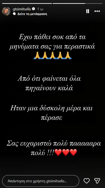 Λίγες ώρες αργότερα, προχωρώντας σε μια νέα δημοσίευση στον προσωπικό του λογαριασμό στο Instagram μετά το εξιτήριο, ο Γιάννης Τσιμιτσέλης εξήγησε ότι όλα εξελίχτηκαν θετικά, ενώ δήλωσε σοκαρισμένος με τις ευχές για περαστικά που δέχτηκε από τον κόσμο.