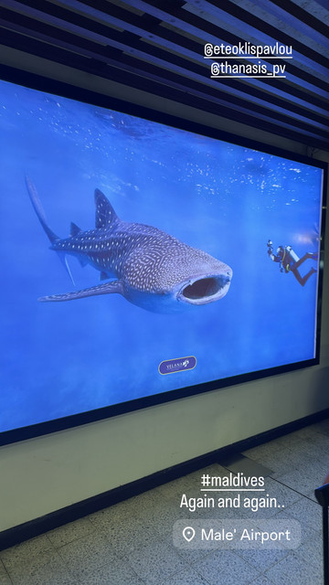 Η Ελένη ανάρτησε φωτογραφία από οθόνη αεροδρομίου με έναν καρχαρία και το σχόλιο: «Μαλδίβες ξανά και ξανά», ενώ η οικογένεια ετοιμαζόταν να επιβιβαστεί στο υδροπλάνο που θα τους μετέφερε στο πολυτελές θέρετρο.