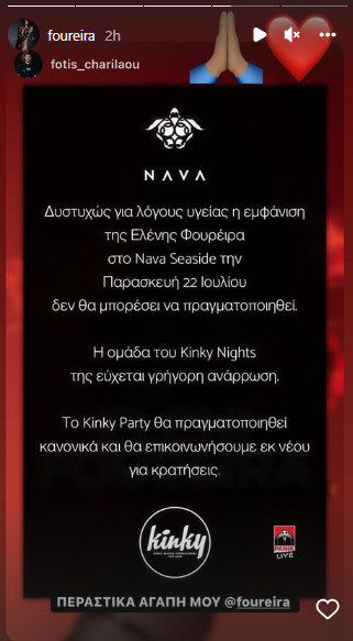 Ωστόσο, όπως έγινε γνωστό από το ίδιο το μαγαζί, η εκρηκτική τραγουδίστρια δεν θα καταφέρει να πραγματοποιήσει την εμφάνισή της, για λόγους υγείας. Την ανακοίνωση έκανε αναδημοσίευση και η ίδια στον προσωπικό της λογαριασμό στο Instagram.