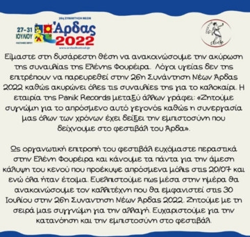 Μάλιστα, δεν είναι η μόνη εμφάνιση που ακυρώθηκε αλλά και μια συναυλία που είχε προγραμματισμένη στο φεστιβάλ του Άρδα στην Ελλάδα. Στην ανακοίνωση, εκτός της αναφοράς που γίνεται για την ακύρωση της εμφάνισης, αναφέρουν ότι ακυρώνονται και όλες οι υπόλοιπες εμφανίσεις της Ελένης Φουρέιρα για το καλοκαίρι.