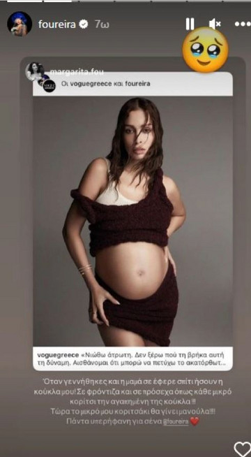 Η Ελένη Φουρέιρα φωτογραφήθηκε για την ελληνική Vogue και πολλοί από τους φίλους, συνεργάτες και την οικογένειά της έκαναν σχετικές αναρτήσεις με τις φωτογραφίες της εγκυμονούσας τραγουδίστριας.