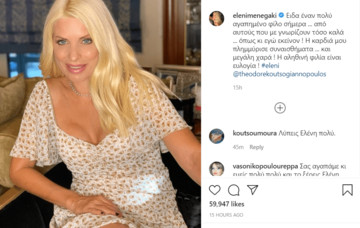 Σε ένα διαφορετικό ποστ στο οποίο εξυνμνεί την αληθινή φιλία προέβη η Ελένη Μενεγάκη. To απόγευμα της Τρίτης η ωραία Ελένη συνάντησε τον πολύ καλό της φίλο Θοδωρή Κουτσογιαννόπουλο και ανέβασε μια φωτογραφία με μια εγκάρδια κατάθεση συναισθημάτων, κάτι που συνηθίζει να κάνει δημόσια η διάσημη παρουσιάστρια.