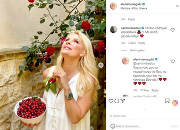 “Τα πιο νόστιμα κερασάκια! Με αυτά μεγαλώσαμε”, έγραψε η Χαριτίνη Ηλιάδου, με την Ελένη Μενεγάκη να απαντά: “Χαριτινάκι μου σε περιμένουμε να δεις τις κερασιές σου και να κάνουμε βουτιές”.