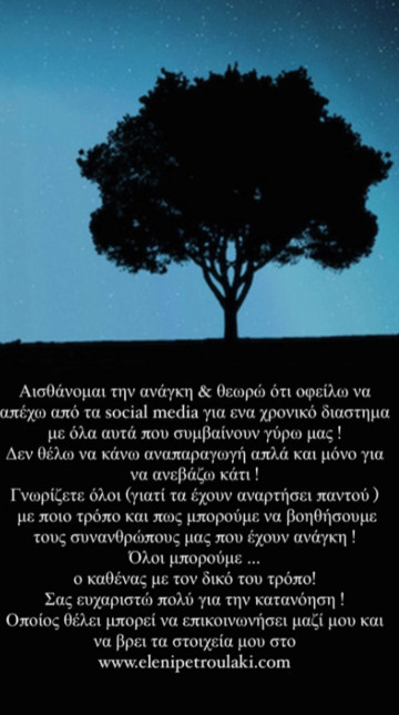 Σοκαρισμένη με όσα συμβαίνουν στην Ελλάδα τις τελευταίες μέρες, η Ελένη Πετρουλάκη αποφάσισε να απέχει από τα social media καθώς έτσι νιώθει.