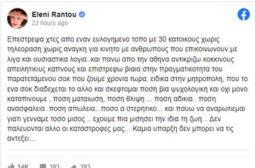 Η Ελένη Ράντου σε ανάρτησή της στον λογαριασμό της στο facebook η Ελένη Ράντου έφραψε: