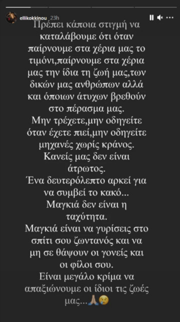 “Πρέπει κάποια στιγμή να καταλάβουμε ότι όταν παίρνουμε στα χέρια μας το τιμόνι, παίρνουμε στα χέρια μας την ίδια τη ζωή μας, των δικών μας ανθρώπων αλλά και όποιων άτυχων βρεθούν στο πέρασμά μας. Μην τρέχετε, μην οδηγείτε όταν έχετε πιει, μην οδηγείτε μηχανές χωρίς κράνος. Κανείς μας δεν είναι άτρωτος. Ένα δευτερόλεπτο αρκεί για να συμβεί το κακό… Μαγκιά δεν είναι η ταχύτητα. Μαγκιά είναι να γυρίσεις στο σπίτι σου ζωντανός και να μη σε θάψουν οι γονείς και οι φίλοι σου. Είναι μεγάλο κρίμα να απαξιώνουμε οι ίδιοι τις ζωές μας.”