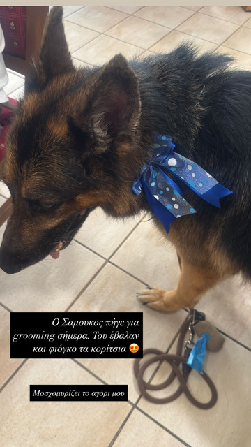 Το κουτάβι, περιποιημένο και φινετσάτο μετά το grooming του, φωτογραφήθηκε με φιόγκο, και όπως έγραψε και η ίδια: «Μοσχομυρίζει το αγόρι μου».