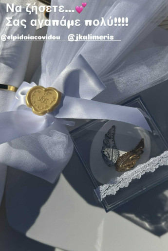 Η μπομπονιέρα, λιτή αλλά άκρως κομψή, ήταν διακοσμημένη με λευκή τούλινη κορδέλα και μια χρυσή σφραγίδα σε σχήμα καρδιάς, που έφερε χαραγμένα τα αρχικά των νεόνυμφων, μια ιδιαίτερη πινελιά που μαγνήτισε τα βλέμματα και έμεινε αξέχαστη στους καλεσμένους.