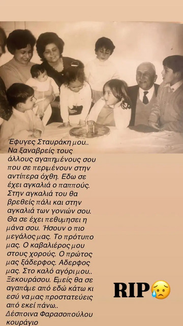 Ο καβαλιέρος μου στους χορούς. Ο πρώτος μας ξάδερφος. Αδερφός μας. Στο καλό αγόρι μου… Ξεκουράσου. Εμείς θα σε αγαπάμε από εδώ κάτω και εσύ να μας προστατεύεις από εκεί πάνω… Δέσποινα Φαρασοπούλου κουράγιο».