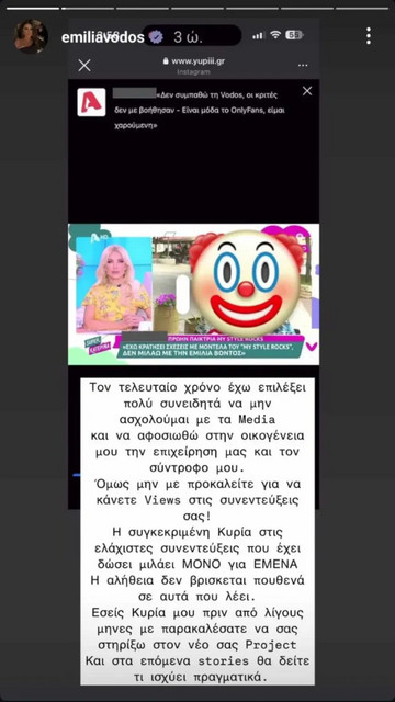 «Η συγκεκριμένη Κυρία στις ελάχιστες συνεντεύξεις που έχει δώσει, μιλάει ΜΟΝΟ για ΕΜΕΝΑ. Πριν λίγους μήνες με παρακαλούσε να τη στηρίξω. Εσείς, Κυρία μου, ψάχνετε φως μέσω εμού», έγραψε χαρακτηριστικά στα stories της.