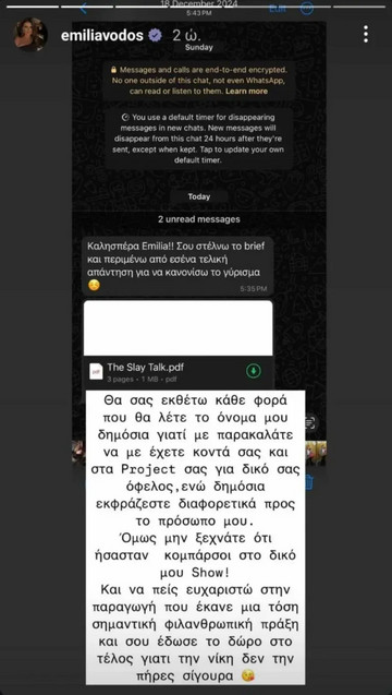 Μάλιστα, η Emilia Vodos δημοσίευσε screenshot μηνύματος από την Όλγα Κοτλιδά, το οποίο –όπως υποστηρίζει– δείχνει ξεκάθαρα την επιθυμία της για συνεργασία. Παράλληλα, ανέφερε ότι υπάρχει και 10λεπτη τηλεφωνική συνομιλία, στην οποία η Όλγα την παρουσιάζει ως «πρώτη καλεσμένη» επειδή «πουλάει». «Το MSR για εμένα έχει τελειώσει. Για εσάς όμως, μάλλον όχι. Δεν αντέχετε που σας έκλεψα το παιχνίδι. Είστε όλες αφαντές!», γράφει η ίδια, αναφερόμενη στο My Style Rocks.