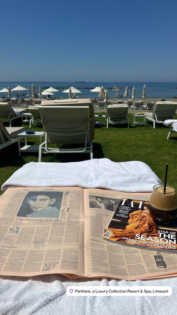 Μαζί της έχει μια εφημερίδα και ένα περιοδικό, αφού το διάβασμα στην παραλία είναι μια από τις αγαπημένες της συνήθειες, ενώ “must thing” είναι και ο αγαπημένος της καφές.
