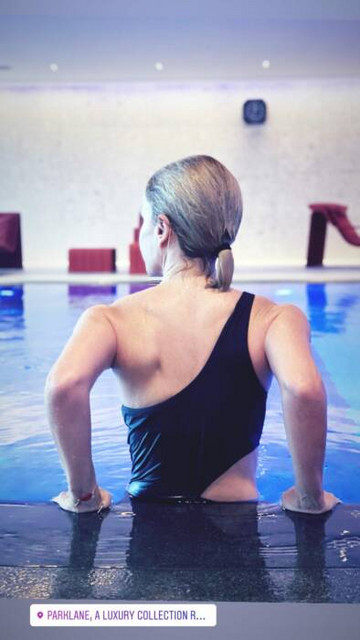 Η ίδια φορώντας το μαγιό της απολαμβάνει την πισίνα και τις παροχές του πεντάστερου ξενοδοχείου.