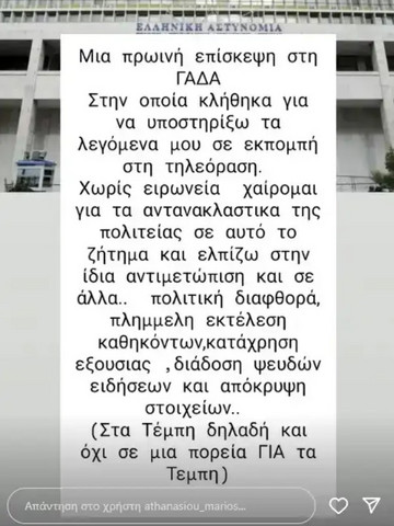 «Μια πρωινή επίσκεψη στη ΓΑΔΑ, στην οποία κλήθηκα για να υποστηρίξω τα λεγόμενά μου σε εκπομπή στην τηλεόραση. Χωρίς ειρωνεία, χαίρομαι για τα αντανακλαστικά της πολιτείας σε αυτό ζήτημα και ελπίζω στην ίδια αντιμετώπιση και σε άλλα… πολιτική διαφθορά, πλημμελή εκτέλεση καθηκόντων, κατάχρηση εξουσίας, διάδοση ψευδών ειδήσεων και απόκρυψη στοιχείων. (Στα Τέμπη δηλαδή και όχι σε μια πορεία για τα Τέμπη)», έγραψε χαρακτηριστικά ο Μάριος Αθανασίου.