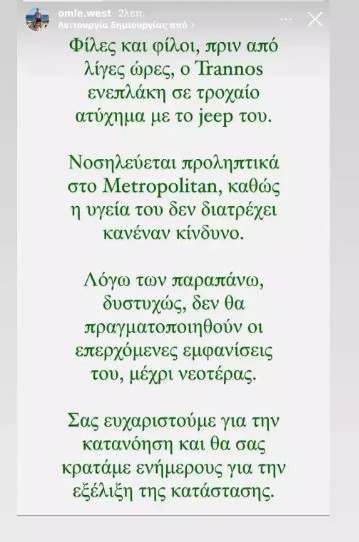 «Φίλες και φίλοι, πριν από λίγες ώρες, ο Trannos ενεπλάκη σε τροχαίο ατύχημα με το jeep του. Νοσηλεύεται προληπτικά στο Metropolitan, καθώς η υγεία του δεν διατρέχει κανέναν κίνδυνο. Λόγω των παραπάνω δυστυχώς, δεν θα πραγματοποιηθούν οι επερχόμενες εμφανίσεις του, μέχρι νεοτέρας. Σας ευχαριστούμε για την κατανόηση και θα σας κρατάμε ενήμερους για την εξέλιξη της κατάστασης», έγραφε η ανακοίνωση του μάνατζερ του τράπερ.