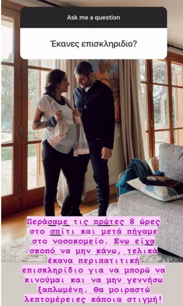 «Η εμπειρία του τοκετού ήταν υπέροχη. Περάσαμε τις πρώτες 8 ώρες στο σπίτι και μετά πήγαμε στο νοσοκομείο. Ενώ είχα σκοπό να μην κάνω επισκληρίδιο, τελικά έκανα περιπατιτική επισκληρίδιο για να μπορώ να κινούμαι και να μη γεννήσω ξαπλωμένη» αποκάλυψε η Εριέττα Κούρκουλου για τον τοκετό.