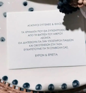 Το πρωί της Κυριακής (31/8) η Εριέττα Κούρκουλου μοιράστηκε τις πρώτες φωτογραφίες από τη βάφτιση του δεύτερου γιου της στα social media, τονίζοντας παράλληλα πως όσα χρήματα μαζεύτηκαν για τον μικρό νεοφώτιστο Λέοντα θα διατεθούν για ανθρωπιστική βοήθεια στην Γάζα.