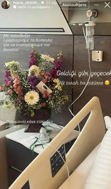 Η Μαρία Εκμεκτσίογλου έκανε την Κυριακή 11 Ιανουαρίου ένα Instagram story από το νοσοκομείο στην Κωνσταντινούπολη, όπου νοσηλεύεται. Την εικόνα που κοινοποίησε τη συνόδευσε με ένα μήνυμα αισιοδοξίας, γράφοντας: