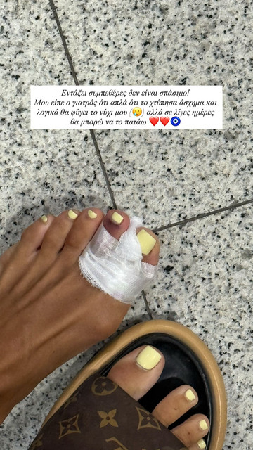 Το περιστατικό συνέβη την Κυριακή 20 Ιουλίου, όταν, όπως αποκάλυψε η ίδια μέσα από stories στο Instagram, χτύπησε το δάχτυλο του ποδιού της σε βράχο την ώρα που κολυμπούσε με την παρέα της.